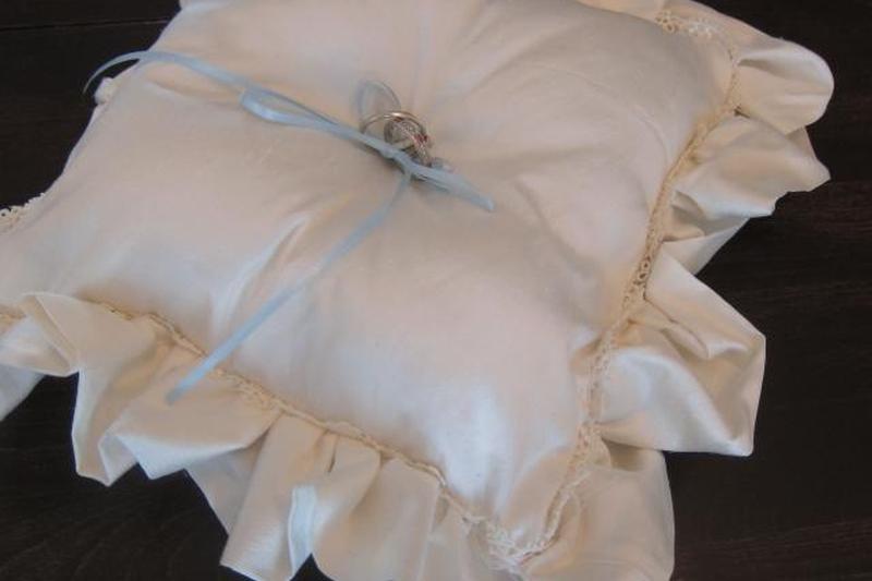Эта милая подушечка для обручальных колец изготовлена из роскошного шелка дупиони, придающего ей тонкий блеск. Шелк бывает всех цветов радуги, но для классического образа выберите белый или цвет слоновой кости. Вы можете украсить его лентой в свадебных тонах. Готовая подушка размером восемь квадратных дюймов, не считая оборки, и на ее изготовление у вас уйдет около двух часов.