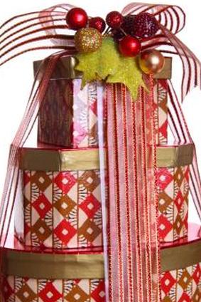 - Поместите стопку подарков в центр лент и поднимите ленты вверх, чтобы завязать их поверх стопки. Сделайте лук и верх с колокольчиками или другим украшением.