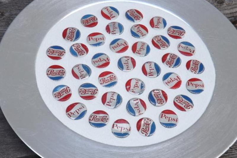 Превратите скучную пластину для зарядного устройства в выложенный плиткой поднос для сервировки, используя крышки от бутылок в качестве плитки. Выбирайте пробки для бутылок с одинаковым логотипом или смесью брендов для красочного разнообразия и создания мозаики.