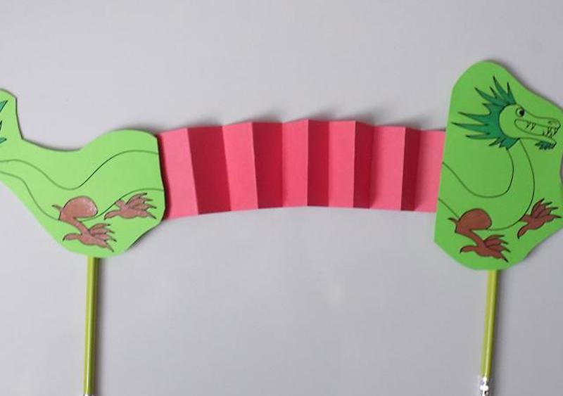 - Сложите гармошкой длинную полосу цветной плотной бумаги, чтобы получилось среднее тело вашего дракона. При желании можно склеить плотную бумагу нескольких цветов, чтобы получилась очень длинная марионетка дракона. Приклейте концы сложенных полосок к затылку и хвосту дракона.