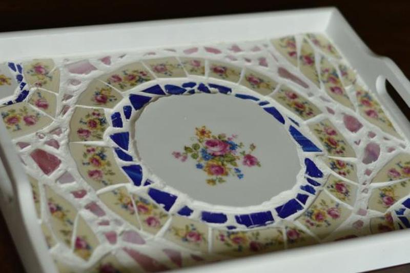 Когда дело касается мозаики, нет никаких правил. Вы можете использовать витражи, плитку, найденные предметы и старинный фарфор. В этом красивом дизайне использовались фарфоровые тарелки из благотворительного магазина, чтобы создать женственный поднос с оборками, который идеально подходит для подачи чая или сервировки угощений для гостей. Он также прекрасно смотрится, просто сидя на журнальном столике.