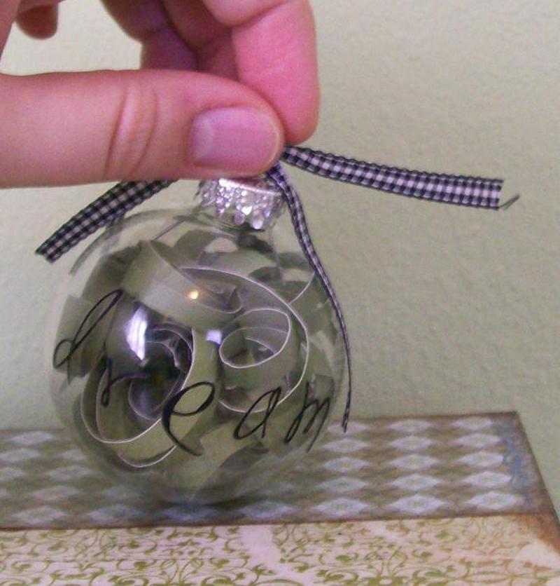 Снимите верхнюю часть прозрачного стеклянного шара с орнаментом и вставьте свернутую бумагу. Когда бумага окажется в орнаменте, она будет немного разворачиваться. Это нормально.