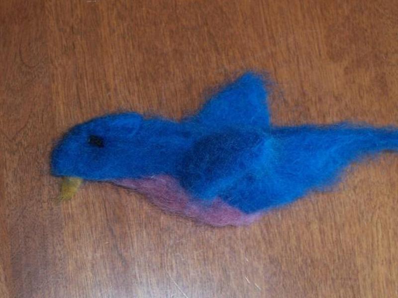 Чтобы сделать синюю птицу, выберите ровинги из шерсти синего, розового, желтого и черного цветов. Сформируйте из синего ровинга грубую форму птицы, как показано.