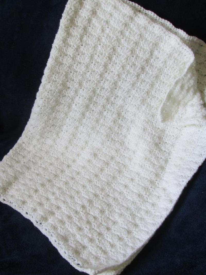 Образец здесь был изготовлен из недорогой камвольной, моющейся пряжи. Хотя образец цвета слоновой кости, который подходит мальчику или девочке, он также может быть выполнен из пестрой пряжи или из яркой или пастельной однотонной пряжи. Рисунок ракушки обеспечивает визуальный интерес и текстуру, а также обеспечивает тепло без сложных изменений цвета пряжи. Образец одеяла было изготовлено из пряжи Lion Brand «Pound of Love» античного белого цвета .