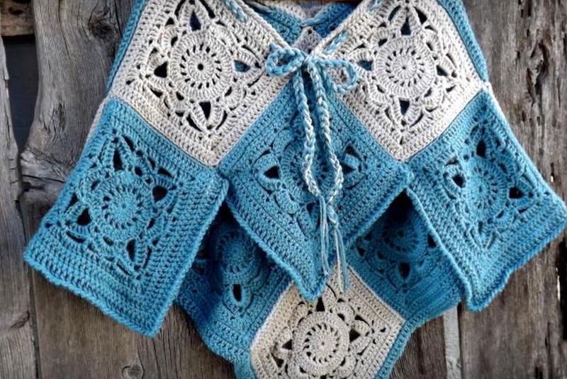 - Также по этой выкройке можно сделать более легкое пончо на весну. Выберите более тонкую пряжу и крючок большего размера, чтобы отрегулировать ее по толщине. Каждый квадрат будет рыхлым, кружевным и воздушным.