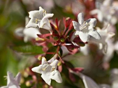 Абелии выносливы в зонах 6-10 USDA и различаются по высоте от 18 дюймов до восьми футов в зависимости от разновидности. Их трубчатые розовато-белые цветы размером от 1/2 до 1 дюйма появляются в начале лета и часто держатся до осени. Хотя цветы маленькие, они собраны вместе в кисти длиной несколько дюймов на концах изящно изогнутых ветвей для драматического эффекта.