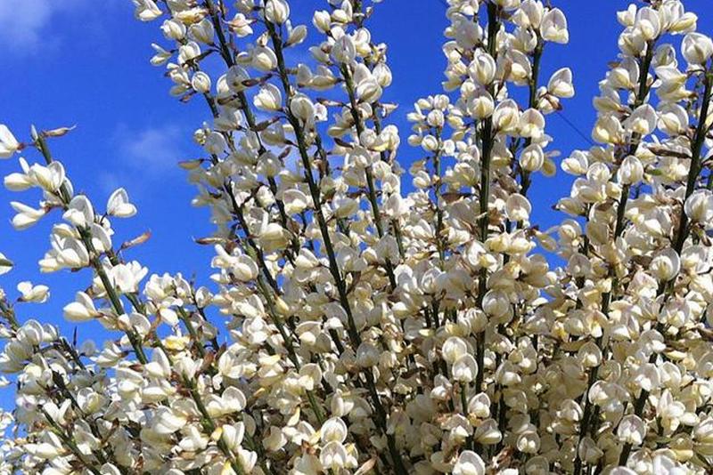 Цитисус двухцветковый (Cytisus Albus Biflorus) — самый ранний из метелок, он аккуратный, растет очень свободно и около 4 футов в высоту. Ярко-желтые цветки появляются в пазухах листьев на длинных побегах.