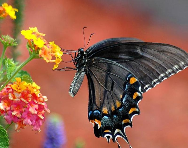 Монарх : Эта большая бабочка распространена во всех районах Среднего Запада, а также по всей стране. Его окраска медно-оранжевые крылья с черными и белыми отметинами. Его предпочтительным растением-хозяином является молочай. Верхние крылья черные, нижние черно-синие с белыми отметинами. Растения-хозяева включают укроп, петрушку, пряный куст и кориандр.