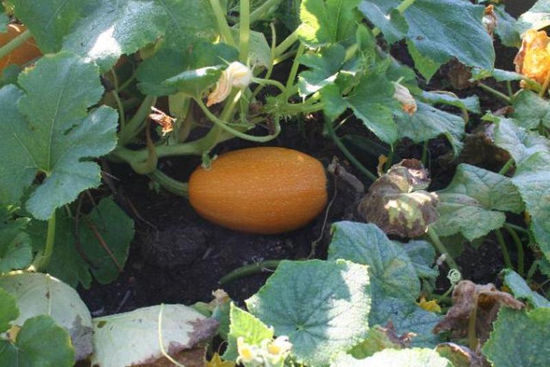 Быть вашим сыщиком, взглянув на весь завод. На этом фото тыква-спагетти, спрятанная среди листьев, выглядит здоровой… но на листьях растения видны проблемы. Они желтеют, а некоторые становятся коричневыми и полностью опадают. Это важные подсказки в определении болезней растений.