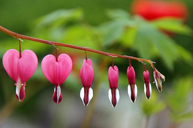 Кровоточащие сердца имеют немного изящный вид с изящно изогнутыми стеблями и тонкой папоротниковой листвой, которая легко повреждается. Цветки маленькие, но эффектные и явно послужили источником названия: они имеют форму сердца, обычно красного или розового цвета, и расщеплены внизу.