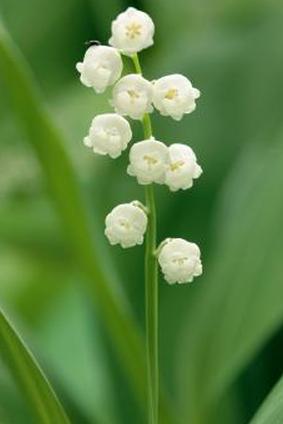У ландыша зеленые листья и белые колокольчатые цветки. Каждое цветущее растение имеет два листа с 5-15 колокольчатыми цветками на стебле между листьями.