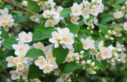 - Philadelphus Mont Blanc — достигает высоты от 4 до 5 футов, имеет довольно прямостоячий рост, с крупными душистыми цветами.