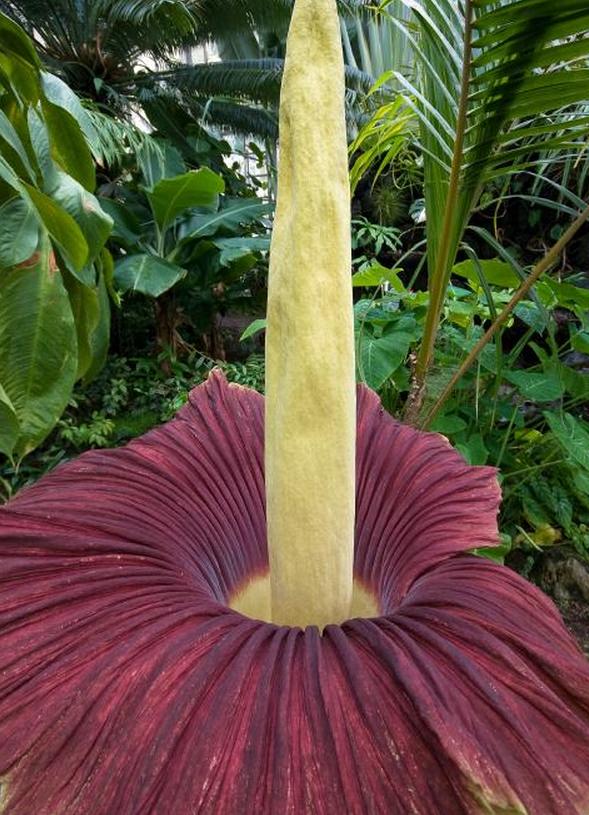 Эта восьмифутовая арумовая лилия пахнет гниющей плотью, запах, предназначенный для привлечения опыляющих ее насекомых. Есть удивительное количество цветов с этой своеобразной эволюционной чертой, хотя этот, безусловно, самый крупный. Цветок полностью раскрывается только на день или два, но всегда привлекает тысячи поклонников (в масках, чтобы выдержать зловоние) в ботанические сады, когда они цветут.