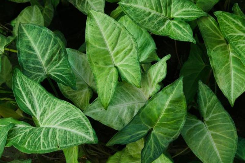 Листья стреловидного растения обычно имеют оттенок от среднего до темно-зеленого, но они также могут иметь оттенки розового, желтого и кремового. Растение, как правило, имеет кустистый характер роста, но со временем растение может начать литься.