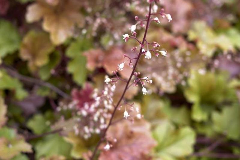 ‘Palace Purple’ имеет темно-фиолетовые листья и цветет белыми цветами в середине-конце весны. Он растет 12-дюймовыми курганами и имеет листья в форме плюща. Он вынослив в зонах с 4 по 9.