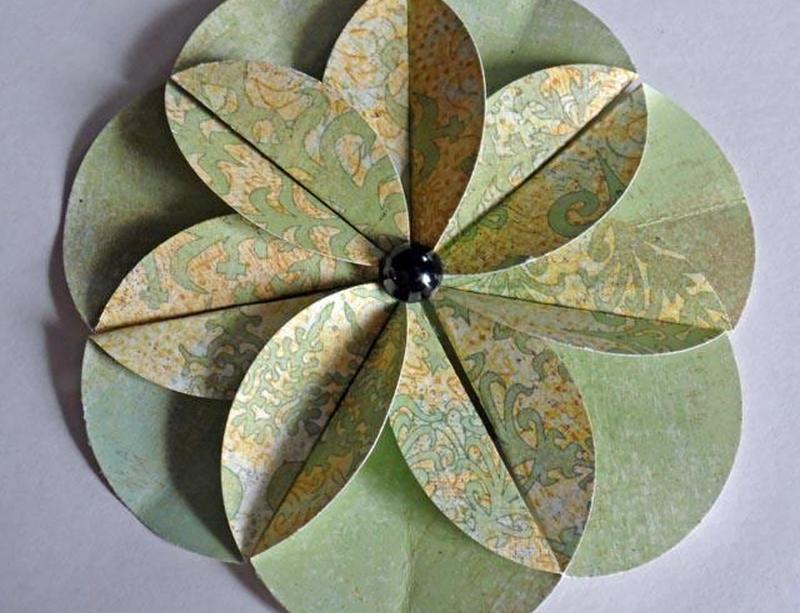 4. Приклейте восемь сложенных кругов к центру первого круга. Расположите их так, чтобы у вас было по два лепестка на каждой четверти первого сложенного круга.