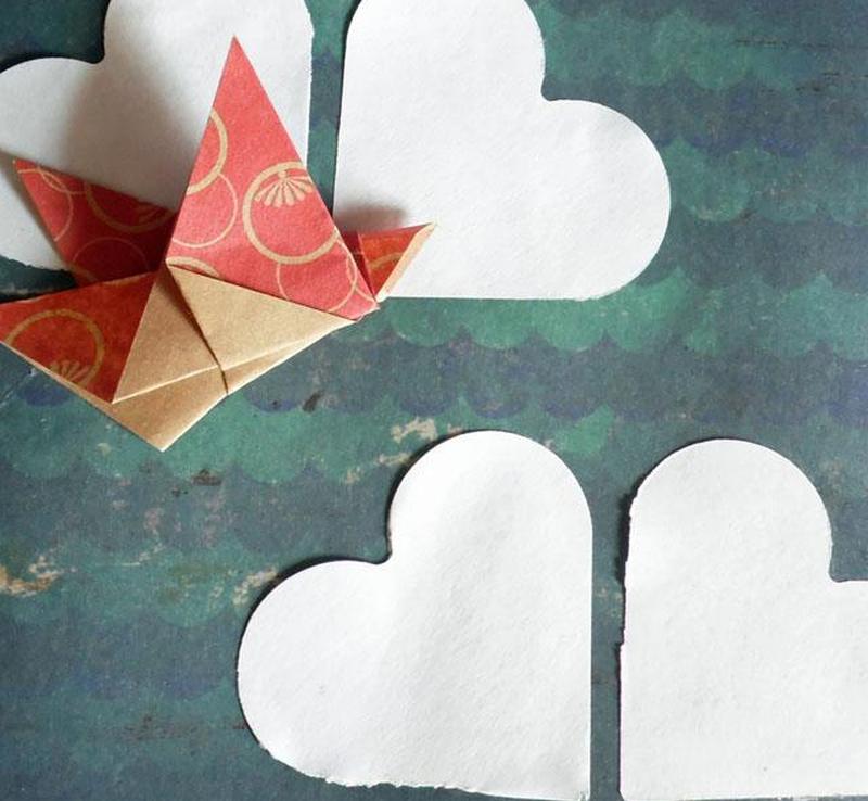 Вырежьте из узорчатой бумаги четыре квадрата. Разрежьте каждый квадрат пополам по диагонали. Расположите вырезанные треугольники в форме вертушки, затем добавьте пуговицу или заклепку в центр.