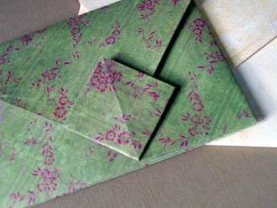 Используйте шаблон конверта, такой как Kreate-a-Lope, чтобы вырезать и сложить конверт из вашей любимой узорчатой бумаги. Если вы хотите продемонстрировать памятные вещи, попробуйте сложить конверт из полупрозрачного пергамента.