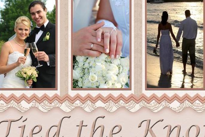 Для тех, кто предпочитает простое заявление, этот макет страницы свадебного альбома включает одно большое пространство для фотографии (или фотоколлажа), а также голубей и узор из лент. Прикрепите настоящий бант из ленты в том месте, где показан розовый бант, и сделайте название жирным с помощью вырезанных букв или наклеек. Это может стать прекрасной вводной страницей для вашего свадебного альбома.