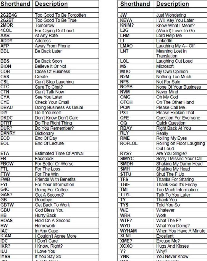 Популярность текстовых сообщений привела к созданию многих широко используемых сокращений. Здесь подробно описаны некоторые из наиболее распространенных и популярных вариантов. LoveToKnow также создал список сокращений для печати, который вы можете скачать для своих целей. Просто щелкните изображение выше, чтобы открыть документ PDF. Если вам нужна помощь в загрузке списка, ознакомьтесь с этими Руководство по Adobe Printables .