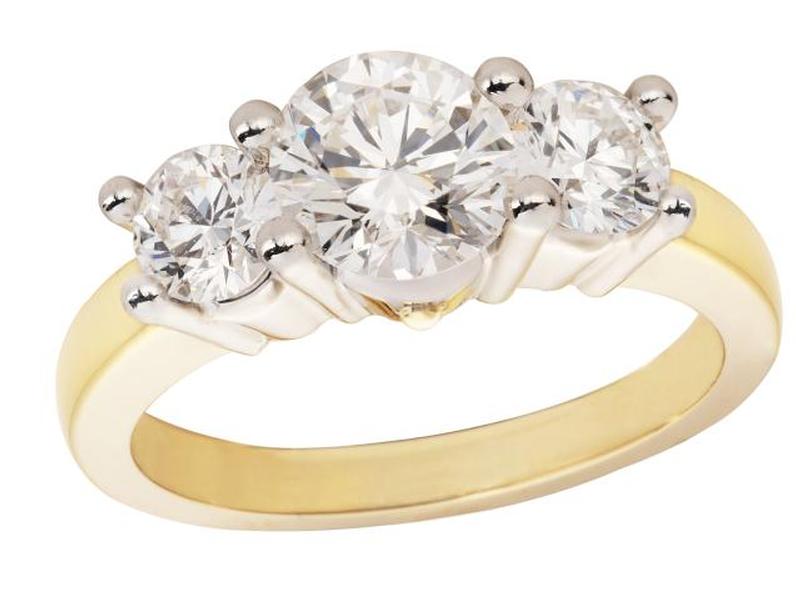 Кольцо с 3 камнями может быть выполнено в простом, но элегантном стиле. В этом кольце из желтого золота используются более мелкие круглые камни, но оно по-прежнему выглядит потрясающе. Хотя во многих стилях используется более крупный центральный камень, этот тип кольца также может быть выполнен из камней аналогичного размера.