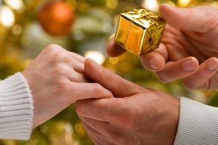 Предложение рождественского подарка — традиционный способ задать вопрос во время праздника. Предложение предполагает подарить обручальное кольцо в качестве рождественского подарка. Некоторые люди предпочитают спрятать обручальное кольцо в другом подарке или в большой упакованной коробке, чтобы она этого не ожидала. Варианты этого включают: Поместите коробку для колец внутри коробки большего размера. Некоторые кладут кольцо в несколько коробок разного размера. Когда она разворачивает каждую коробку, ее ведут к коробке поменьше, пока она не доберется до коробки с кольцом.
