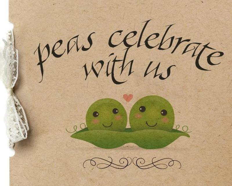 Тема «два гороха в стручке» — идеальная тема весенней или летней свадьбы. Зеленый цвет , может быть включен в различных способах для дополнения аспекта горохового стручка и до сих пор создают и красивую, элегантную и капризную атмосферу. Вы можете найти симпатичные, уникальные , готовые приглашения в виде стручков гороха, воспользоваться услугами художника или компании по производству канцелярских товаров и приглашений, чтобы сделать приглашения на заказ, или даже сделать их самостоятельно, используя свой домашний компьютер. Ниже приведены несколько полезных ресурсов: