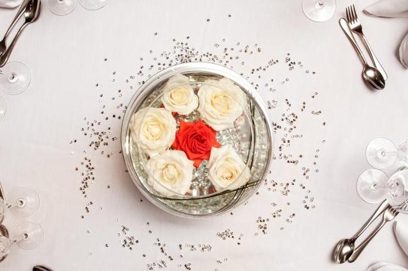 Показанный здесь центральный элемент отличается от традиционных букетов своими одиночными цветами в стеклянной вазе, наполненной декоративными стеклянными бусинами. Это создает элегантный современный вид, который подходит для большинства типов свадеб.