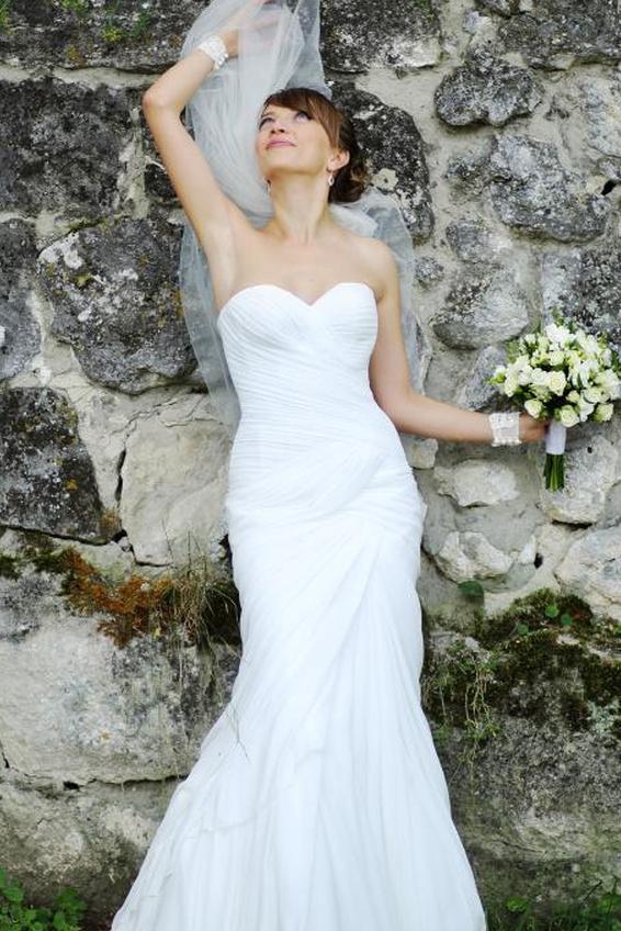 Вырез сердечком идеально подойдет к красивому бальному платью. Этот вырез подчеркнут лифом со сборками. Юбка каскадом с великолепными усталыми оборками подходит для формальной свадьбы или свадьбы в замке или соборе. Платье представлено в белом цвете и цвете слоновой кости в размерах от 2 до 26Plus.