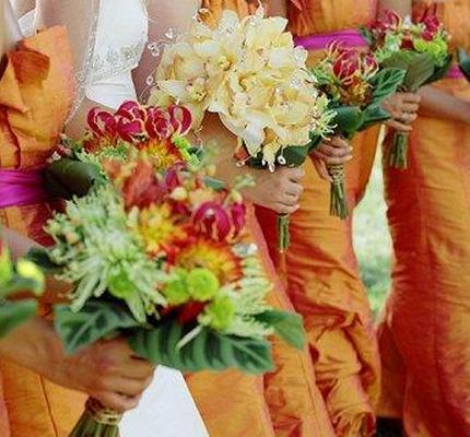 Осенние свадебные цветы, рубиновые или янтарные украшения и золотые сандалии с ремешками — идеальные аксессуары, чтобы подчеркнуть ярко-оранжевые платья подружек невесты, не кажущиеся тусклыми или грязными.