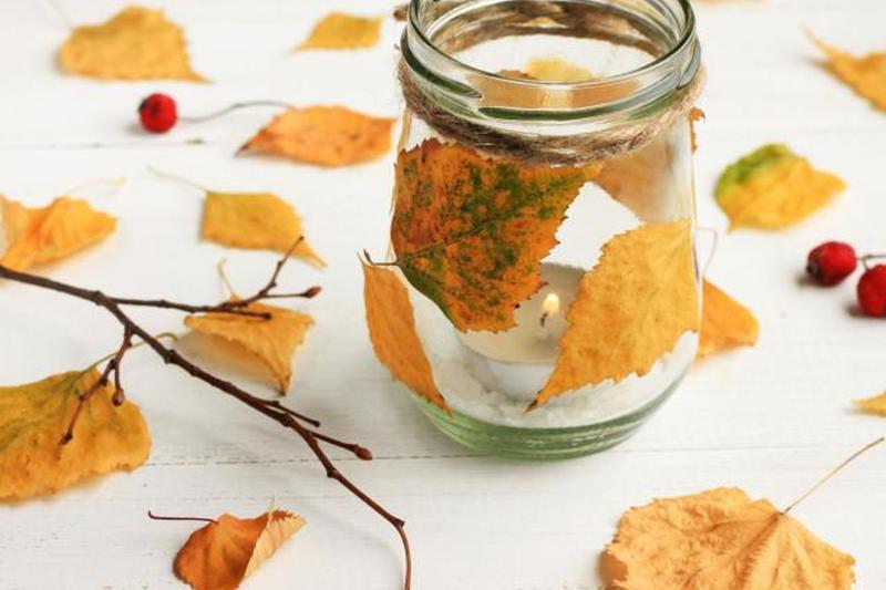 Свеча, в которой используются осенние листья, наверняка понравится всем, и она может помочь осветить ваш приемный стол. Умножьте расходные материалы на количество гостей, чтобы их хватило на всех.
