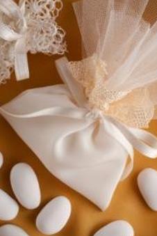 Обычно сделанные из органзы или тюля, прозрачные сумки легко сделать. Просто нарежьте ткань на восьмидюймовые квадраты, пока у вас не получится необходимое количество пакетов. В центр каждого квадрата положите пять миндальных орехов, покрытых сахаром. Соберите ткань вместе и перевяжите лентой. Если вы предпочитаете покупать уже готовые сумки, их легко можно приобрести в магазинах для рукоделия и магазинах для вечеринок.