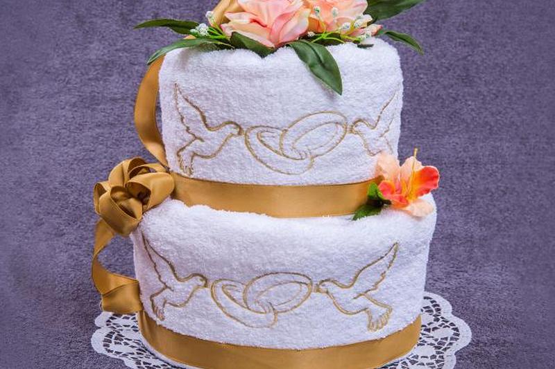 Торт из полотенец — это уникальное сочетание банных полотенец, полотенец для рук и тряпок для мытья посуды, чтобы создать многоуровневое «кондитерское изделие», которое выглядит так же роскошно, как любой дизайнерский свадебный торт. Торты из полотенец можно использовать для разных подарков и украшений, в том числе: