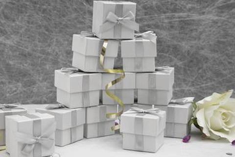 Эти картонные подарочные коробки для свадебных платьев и смокингов мгновенно привлекут внимание ваших гостей, когда они будут сидеть за столом, и идеально подходят для элегантной тематической свадьбы. Они рассчитаны на две конфеты Ferrero Rocher , но вы можете наполнить их чем угодно. Продаваемые наборами по 100 штук по цене чуть менее 12 долларов, эти сувениры очаровательны и недороги.