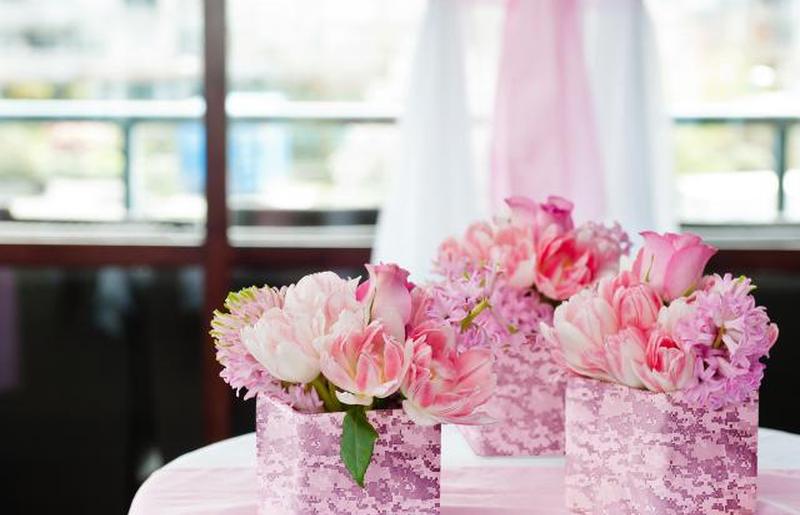 Камуфляж не обязательно должен быть мужским. Вы можете добавить несколько камуфляжных бантов к простым цветочным композициям, чтобы создать великолепный и нежный центральный элемент в стиле кантри. Поместите стеклянные банки на деревянные пьедесталы, чтобы действительно подчеркнуть этот милый вид.