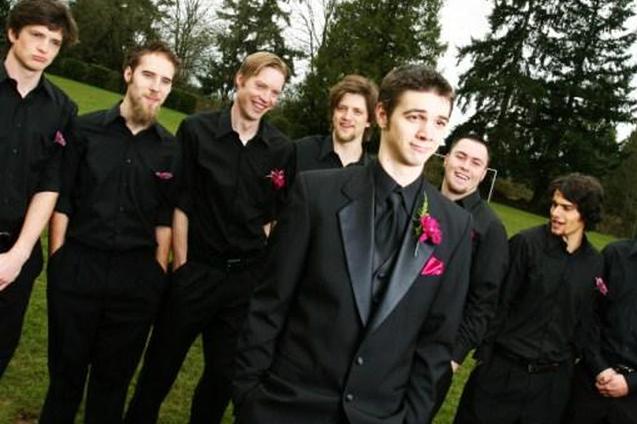 Простой способ изменить типичную позу бок о бок — сделать так, чтобы жених выступил перед своими мужчинами. С камерой под небольшим углом снимок по-прежнему остается довольно традиционным, но имеет современный вид.
