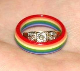 - Радужные кольца : не выбирая конкретное кольцо для гей-парада, гей-пары могут выбрать кольцо, которое может включать в себя некоторые элементы радуги менее очевидным образом. Титан особенно популярен, потому что сам металл может быть окрашен в разные цвета.
