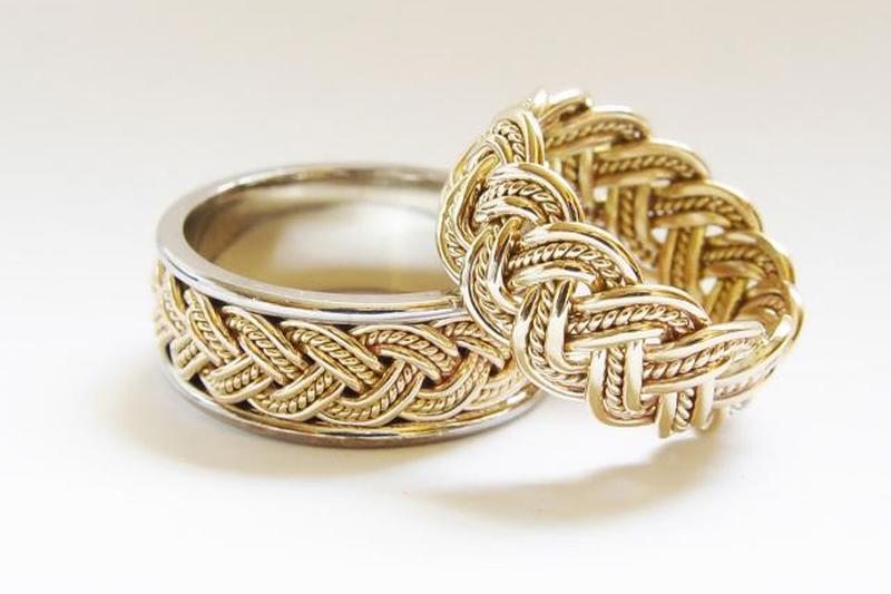 - Это великолепное плетеное обручальное кольцо из 14-каратного желтого золота с толстым, прочным, плетеным переплетением доступно в Fan Designs .