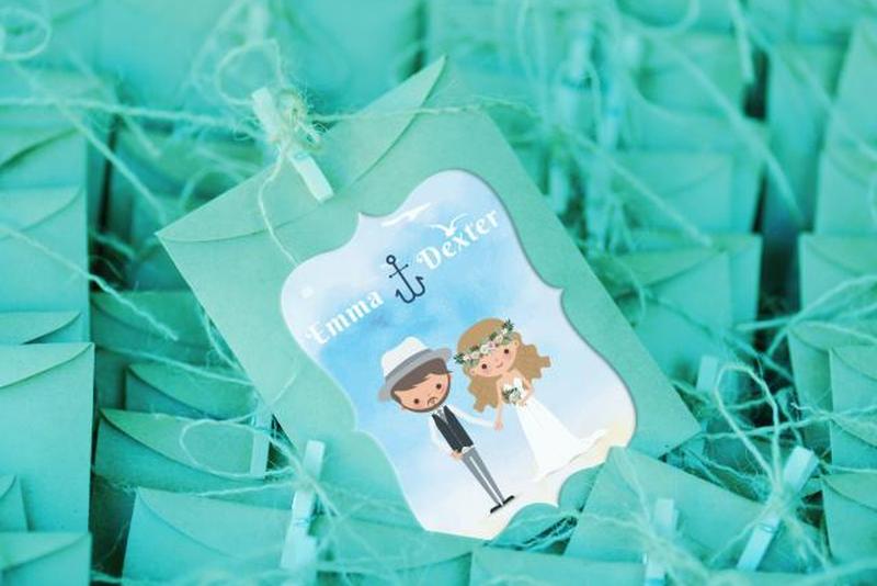 Некоторые наклейки изящны и непритязательны, а другие весьма внушительны. Свадебные украшения в пляжной тематике предлагают множество возможностей для использования цвета, рисунка и текстуры, чтобы привлечь внимание или добавить тонкий штрих к сувенирам. Как правило, сочетайте богато украшенные сумки с простыми наклейками.