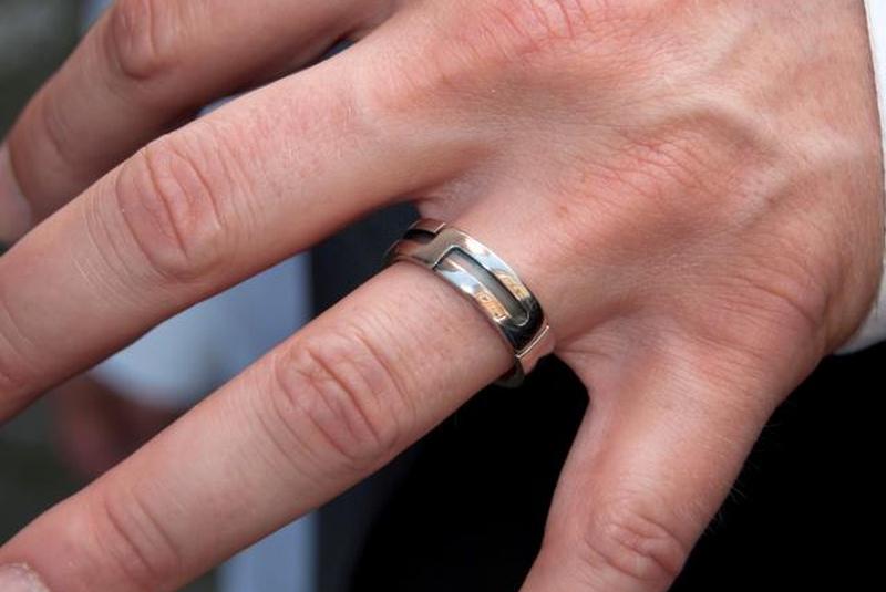 - Двухцветное мужское обручальное кольцо с атласной отделкой — это простое изделие из 14-каратного белого и желтого золота со скошенными краями и атласной отделкой. Его ширина пять миллиметров, а его розничная цена составляет от 218 до 246 долларов, в зависимости от размера.