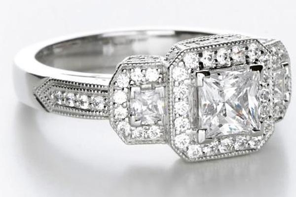 Боковые камни могут добавить старинному стилю традиционному кольцу. Этот потрясающий дизайн в стиле ар-деко украшен центральным бриллиантом огранки «принцесса» весом 0,75 карата, окруженным филигранными бриллиантами и бриллиантами меньшего размера. Это изысканное платиновое обручальное кольцо продается по цене около 6900 долларов.
