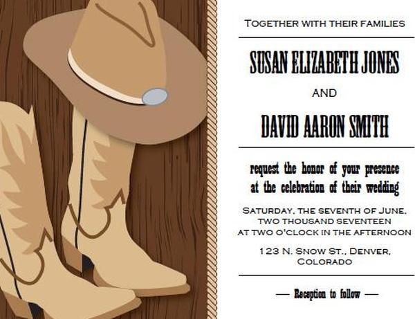 Например, ничто так не говорит о деревенской свадьбе, как ковбойские сапоги и ковбойская шляпа, как показано выше. Это отличный вариант для пар, которые наденут на свадьбу свои лучшие западные наряды. Однако ваши варианты не ограничиваются приглашениями, подчеркивающими одежду.