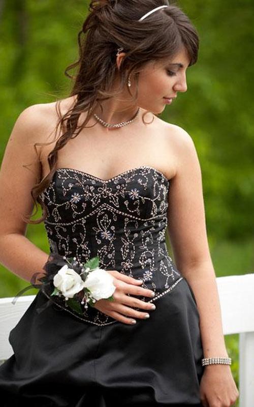 Это красивое платье выглядит так, будто оно принадлежит принцессе на королевском балу. Лиф с вырезом в форме сердца и белым нижним слоем с накладкой из черного кружева. Задняя часть на шнуровке для изящного образа. На талии есть розочки черного и белого цветов, которые уступают место пышной шифоновой юбке.