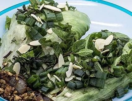- Сверху салатные обертки с зеленым луком, мятой и измельченным миндалем, если это необходимо.
