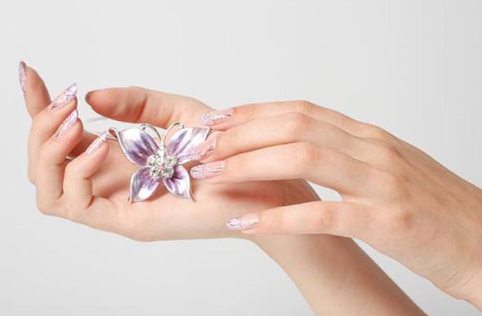Чтобы начать создавать эти свежие сказочные ногти, начните с ногтей, окрашенных в очень светлый лавандовый или сиреневый цвет.