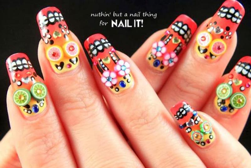 Это простой, но художественный дизайн черепа с яркими цветами. В то время как этот дизайн можно сделать на любом ногте, здесь он выглядит на длинных сквоватых ногтях (квадратных с закругленными углами).