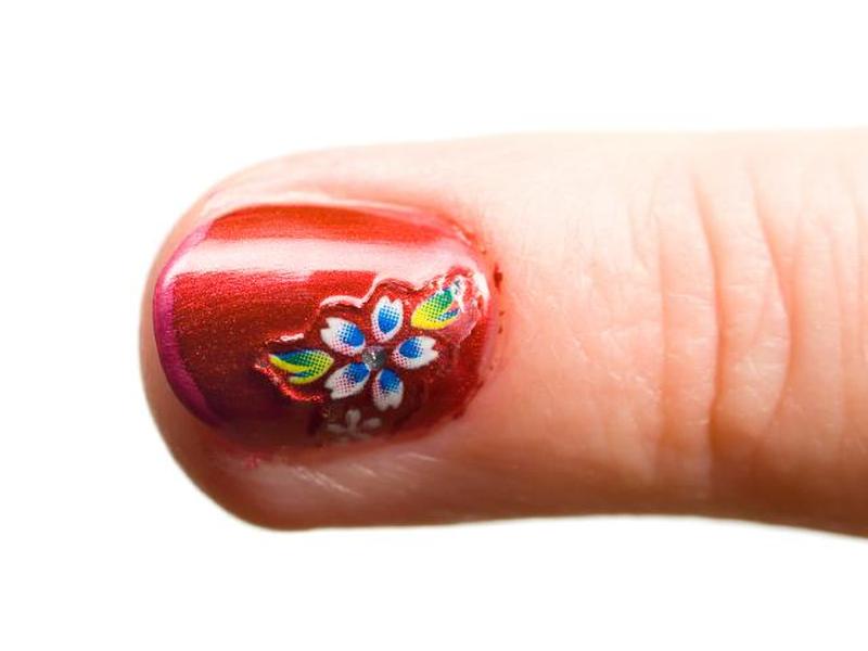 Этот яркий красный ноготь имеет розовый кончик и идеально выполненный сине-бело-желтый цветок с кристаллом в центре. Полировка вокруг цветочного узора слегка приподнята, чтобы привлечь дополнительное внимание к деталям.