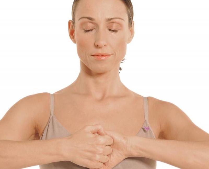- Держа ладони вместе, поверните каждую руку так, чтобы кончики пальцев указывали на противоположный локоть, а правая ладонь была обращена к телу.
