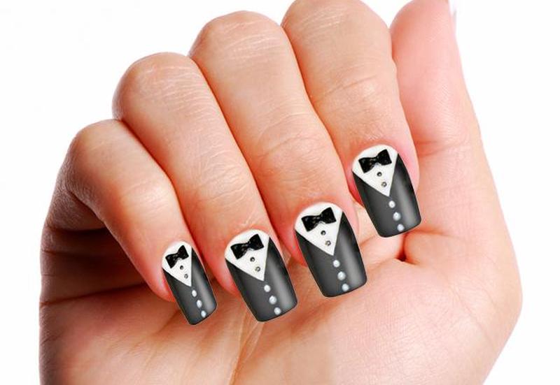 - Добавьте пуговицы, которые можно сделать кончиком зубочистки, точечным инструментом или кончиком кисти для мелких деталей. Нанесите черный лак на белую рубашку и белый лак на черный пиджак.