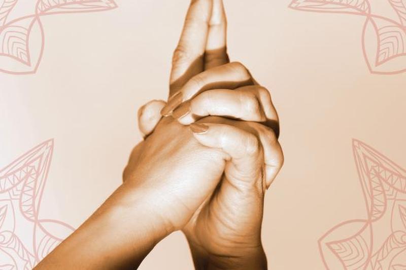 - Сожмите ладони вместе и убедитесь, что ваши большие пальцы плотно скрещены, а подушечки больших пальцев в основном лежат в областях между основанием больших пальцев и суставами указательных пальцев.